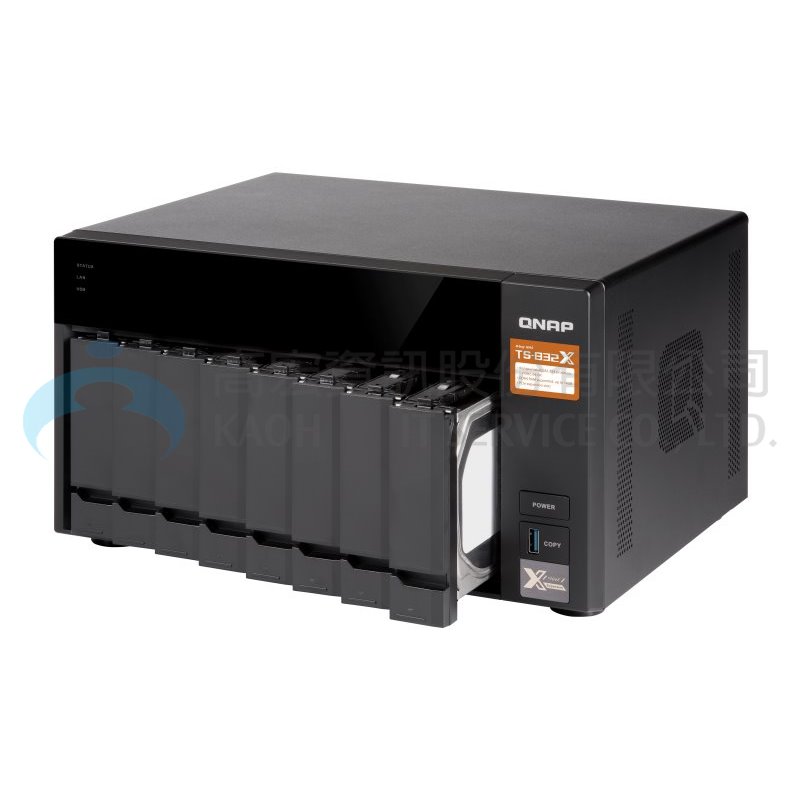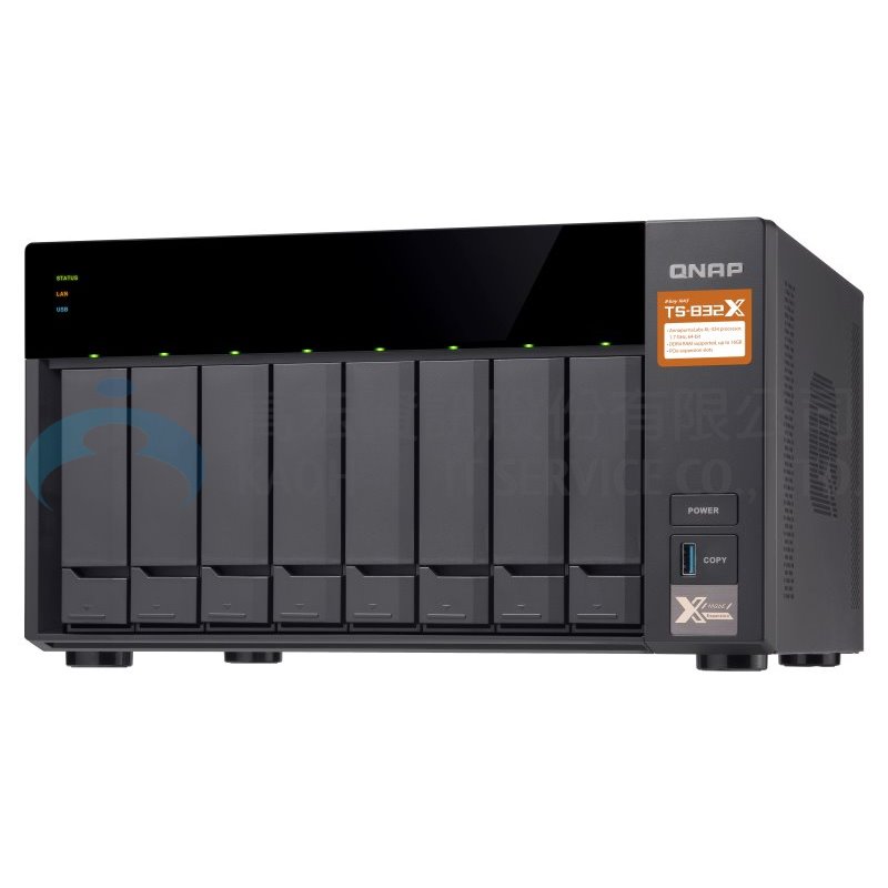 TS-832X 支援 8 顆硬碟,為功能強大、高性價比的四核心 NAS 解決方案;內建 10GbE SFP+ 雙網路埠,讓您輕鬆以大眾化的價格享受企業級 10GbE 高速傳輸速度,更是支援 Qtier™ 自動分層儲存的 ARM 架構 NAS,容量與效能兼備。多元的 PCIe 擴充性增添 NAS 應用潛能,搭配 QNAP 新推出的 PCIe 無線網卡 QWA-AC2600,即可將 TS-832X 變成專屬無線基地台,讓多個裝置享受直達 NAS 的專屬網路頻寬。